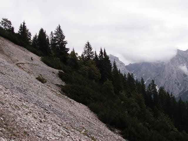 Lots of scree fields on the Hohenweg, but we are getting used to them and more confident in general. You can see Phyllis in the upper left, about to re-enter the trees after traversing a rocky section. The clouds lifted as the morning passed.