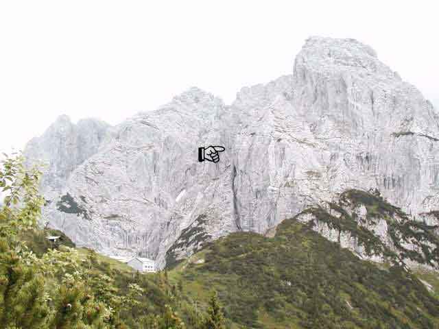 The hand points to a mountain climber on the Totenkirchl (Church of the Dead). He is just a tiny blue speck in this picture, but we watched him and others descend from the summit of Ellmaner Halt as we sat on the terrace of the Stripsenjochshaus.