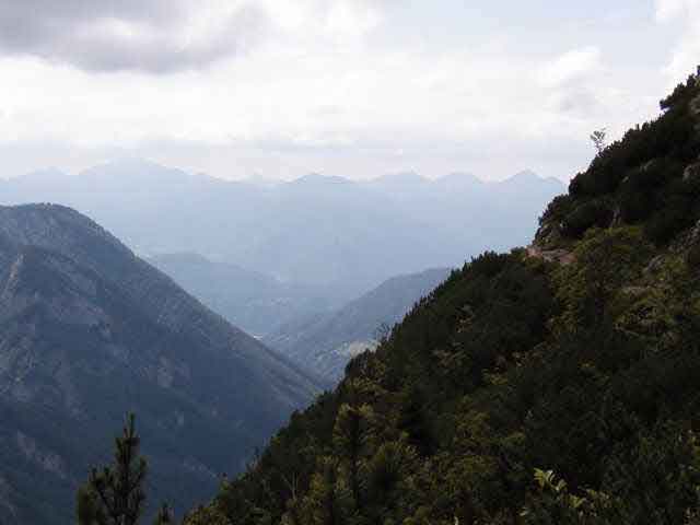 The notch on the nearby hill is our trail. the patch of light green down the valley is a meadow below the Vorderkaiserfelden Hütte.