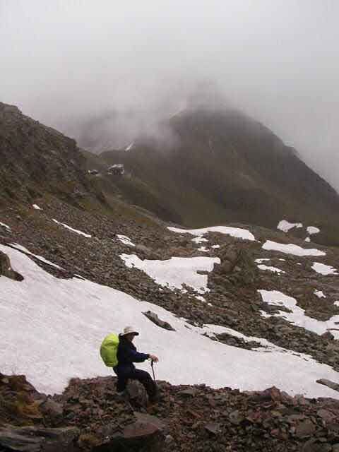 The hike from Innsbrucker to Bremmer is a long one, six to seven hours. It is not long before we are crossing snow fields. The weather is poor, drizzling rain and cool. The trail is rocky, steep, and wet, making slow going, especially across snow. |