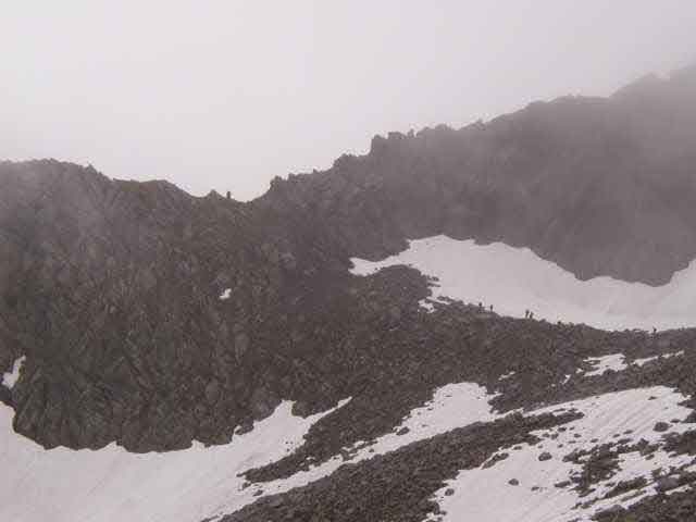 A party of five hikers was about 40 minutes ahead of us. You can see them silhouetted against the snow field on the right side of the picture. They (and we) are headed for the notch in the ridge just left of center. You can see the large cairn standing like a post at the notch. There were six of these ridges to cross on our hike that day.