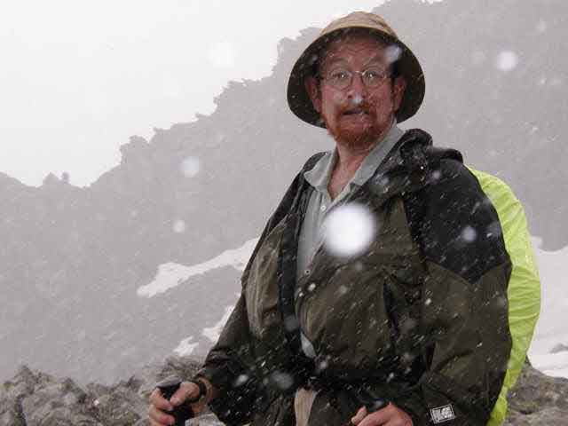 We are about where the party ahead of us was on the last picture, just below the second saddle. You can see the cairn again, but much closer.. The weather continues to worsen, with the rain turning to snow. We can hear a party of young Californians behind and above us, singing "I'm Dreaming of a White Christmas".