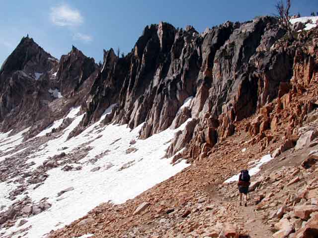 Final switchbacks in the climb to Cramer Pass on day two of the Sawtooths.