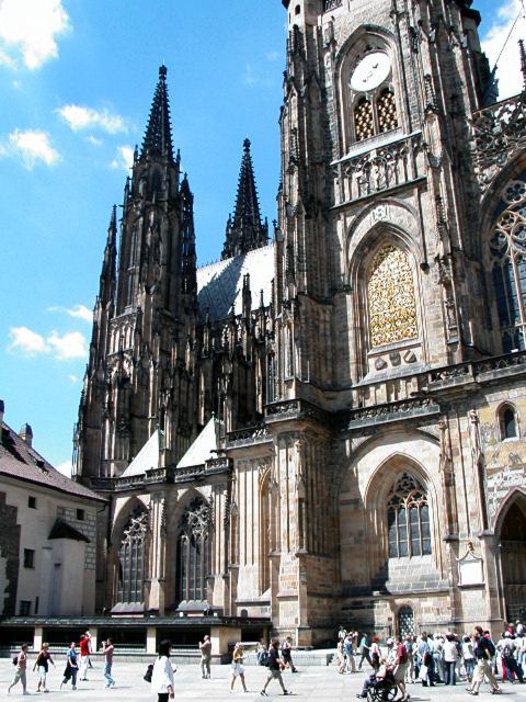 St. Vitus Cathedral, in gothic style, stands in a courtyard of Prague Castle.