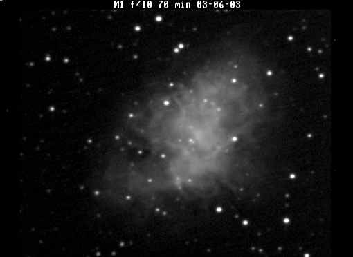 Object: M1, The Crab Nebula Observer: G.K.Webber Date/Time: 03-06-03 Origin: Lawrence, KS Camera: Starlight Xpress MX516 Telescope: 8" Meade LX200 Accessories: none Focal Ratio: f/10 Exposure time: 70 min. Processing: dark,flat, normal stretch, power law stretch, unsharp mask Filters Used: none |