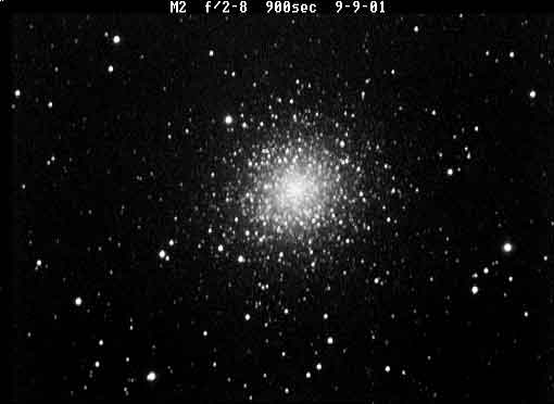 Object: M2, globular cluster Observer: G.K.Webber Date/Time: 9/9/01 Origin: 38:58:4 N, 95:16:6 W, Lawrence, KS Camera: Starlight Xpress MX516 Telescope: 8" Meade LX200 Accessories: Optec Maxfield focal reducer, field flattener Focal Ratio:f/2.8 Exposure time: 1200 sec. Processing: dark, normal stretch, power law stretch, unsharp mask, center mask with Photoshop Filters Used: none Notes: |