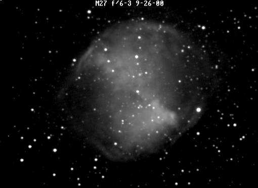 Object: M27, The Dumbell Nebula Observer: G.K.Webber Date/Time: 9/26/00 16:45:56 Origin: 38:58:4 N, 95:16:6 W, Lawrence, KS Camera: Starlight Xpress MX516 Telescope: 8" Meade LX200 Accessories: Celestron f/6.3 focal reducer, field flattener Focal Ratio:f/7.0 Exposure time: 1800 sec. Processing: dark, normal stretch, power law stretch, normal stretch Filters Used: none Notes: |