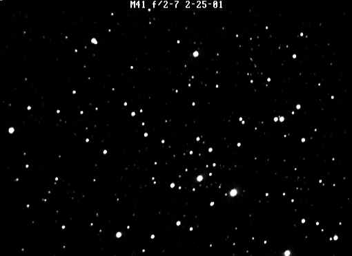 Object: M41, open cluster Observer: G.K.Webber Date/Time: 02/25/01 time unknown Origin: 38:58:4 N, 95:16:6 W Lawrence, KS Camera: Starlight Xpress MX516 Telescope: 8" Meade LX200 Accessories: none Focal Ratio: f/2.8 Exposure time: 1200 sec. each Processing: dark, normal stretch, power law stretch, Filters Used: none |