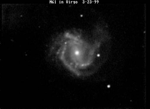 Object: M61, spiral galaxy Observer: G.K.Webber Date/Time: 3/24/99 07:37:30 Origin: 38:58:4 N, 95:16:6 W, Lawrence, KS Camera: Starlight Xpress MX516 Telescope: 8" Meade LX200 Accessories: none Focal Ratio: f/10 Exposure time: 1200sec. Processing: dark, normal stretch, power law stretch Filters Used: none Notes: |