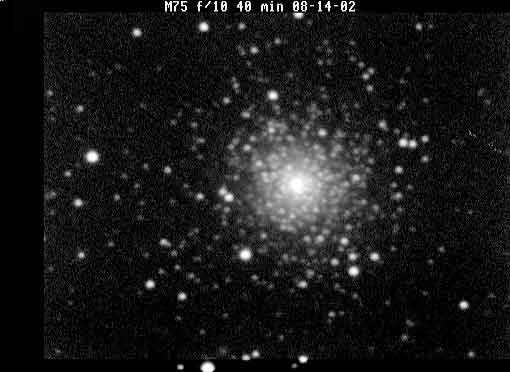 Object: M75, globular cluster Observer: G.K.Webber Date/Time: 08/14/02 Origin: 38:58:4 N, 95:16:6 W Lawrence, KS Camera: Starlight Xpress MX516 Telescope: 8" Meade LX200 Accessories: Optec Maxfield focal reducer/field flattener, f/3.3 Focal Ratio: f/10 Exposure time: 40 min.. Processing: dark, flat, normal stretch, non-linear stretch, unsharp mask, center mask Filters Used: none Notes: |