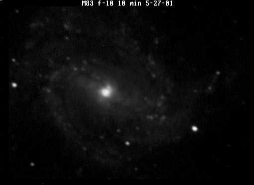Object: M83, Spiral Galaxy Observer: G.K.Webber Date/Time: 5/27/01 Origin: 38:58:4 N, 95:16:6 W, Lawrence, KS Camera: Starlight Xpress MX516 Telescope: 8" Meade LX200 Accessories: none Focal Ratio:f/10 Exposure time: 600 sec. Processing: dark, normal stretch, power law stretch, unsharp mask Filters Used: none Notes: |