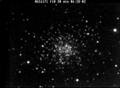 Object: NGC6171, globular cluster Observer: G.K.Webber Date/Time:06/28/02 Origin: 38:58:4 N, 95:16:6 W, Lawrence, KS Camera: Starlight Xpress MX516 Telescope: 8" Meade LX200 Accessories: none Focal Ratio:f/10 Exposure time: 1800 sec. Processing: dark, normal stretch, power law stretch, unsharp mask Filters Used: none Notes: |