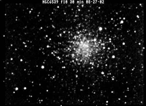Object: NGC6539, globular cluster Observer: G.K.Webber Date/Time:08/27/02 Origin: 38:58:4 N, 95:16:6 W, Lawrence, KS Camera: Starlight Xpress MX516 Telescope: 8" Meade LX200 Accessories: none Focal Ratio:f/10 Exposure time: 1800 sec. Processing: dark, normal stretch, power law stretch, unsharp mask Filters Used: none Notes: |