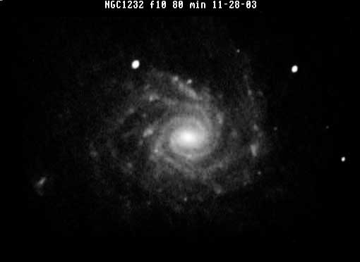 Object: NGC1232, face-on spiral galaxy Observer: G.K.Webber Date/Time: 11/28/2003 Origin: 38:58:4 N, 95:16:6 W, Lawrence, KS Camera: Starlight Xpress MX516 Telescope: 8" Meade LX200 Accessories: none Focal Ratio: f/10 Exposure time: 4800 sec. Processing: dark, normal stretch, power law stretch Filters Used: none Notes: |