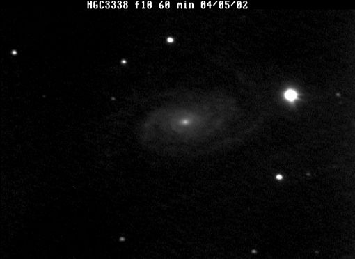 Object: NGC 3338, spiral galaxy Observer: G.K.Webber Date/Time: 04/05/02 Origin: 38:58:4 N, 95:16:6 W, Lawrence, KS Camera: Starlight Xpress MX516 Telescope: 8" Meade LX200 Accessories: none Focal Ratio: f/10 Exposure time: 3600 sec Processing: dark frame, normal stretch, power law stretch, unsharp mask Filters Used: Notes: |
