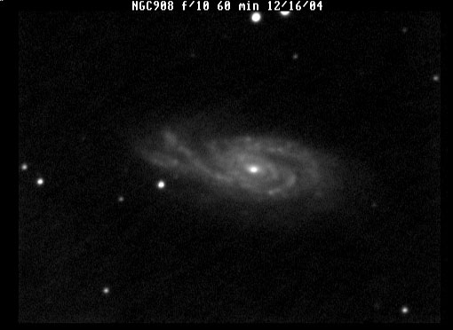 Object: NGC908, spiral galaxy Observer: G.K.Webber Date/Time: 11/15/2003 Origin: 38:58:4 N, 95:16:6 W, Lawrence, KS Camera: Starlight Xpress MX516 Telescope: 8" Meade LX200 Accessories: none Focal Ratio: f/10 Exposure time: 1200sec. Processing: dark, normal stretch, power law stretch Filters Used: none Notes: |