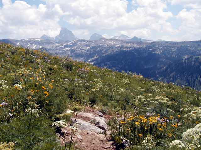 Our final view of the Grand Tetons, over the flower-covered shoulder of Beard Mountain.